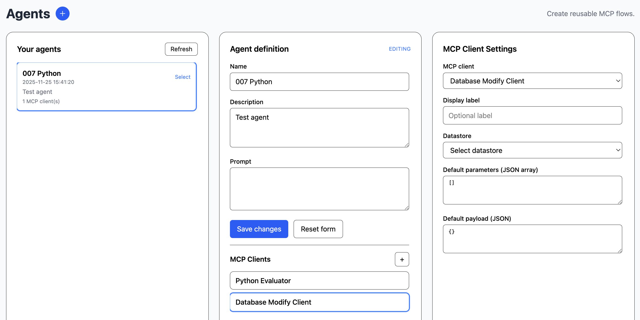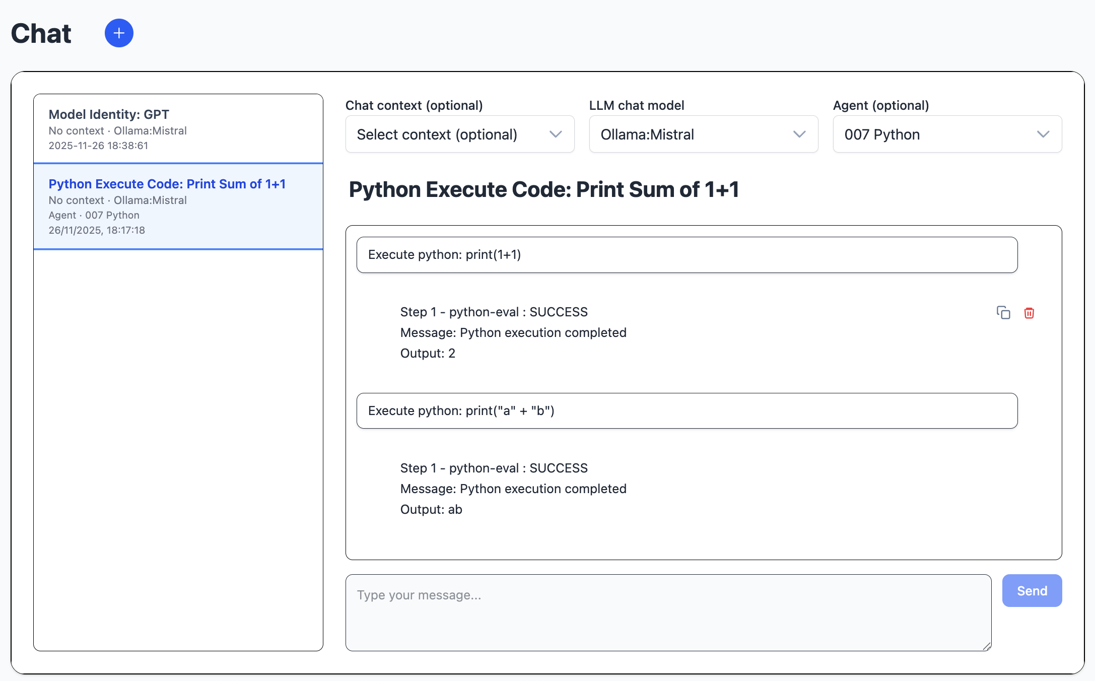 Conversations belong to individual users. They consists of context, llm and agent selection, as well as user and assistant message history. The first user message is used to set the name of the conversation. The chat uses Spring AI chat history.