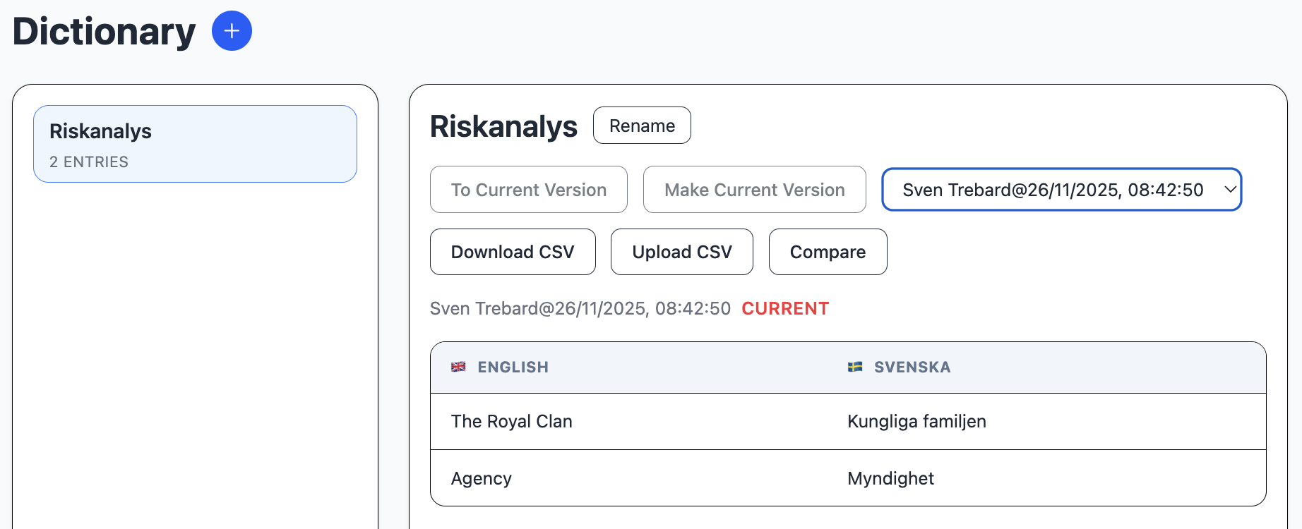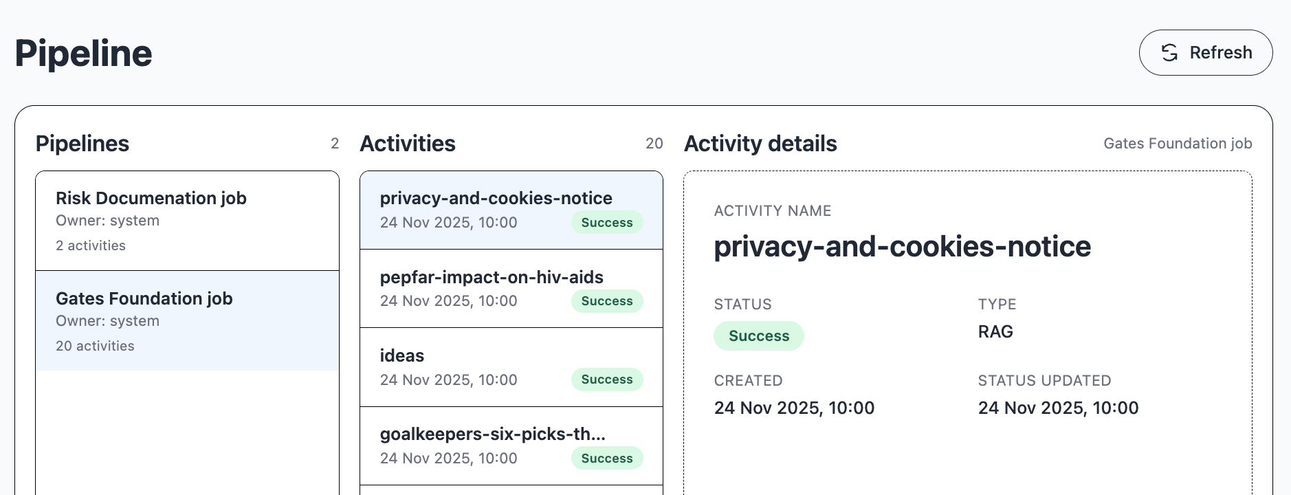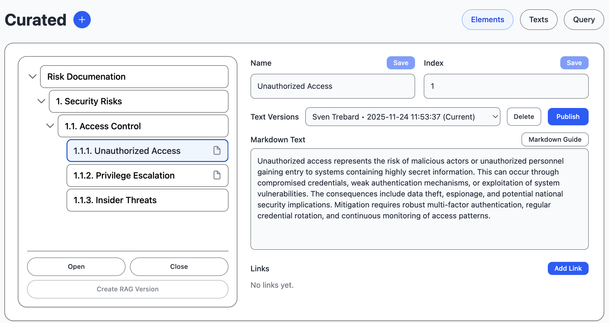 You select a top element and start a pipeline job to create embeddings for all texts below the top element. The embeddings are associated with a new version, so you can compare text changes.