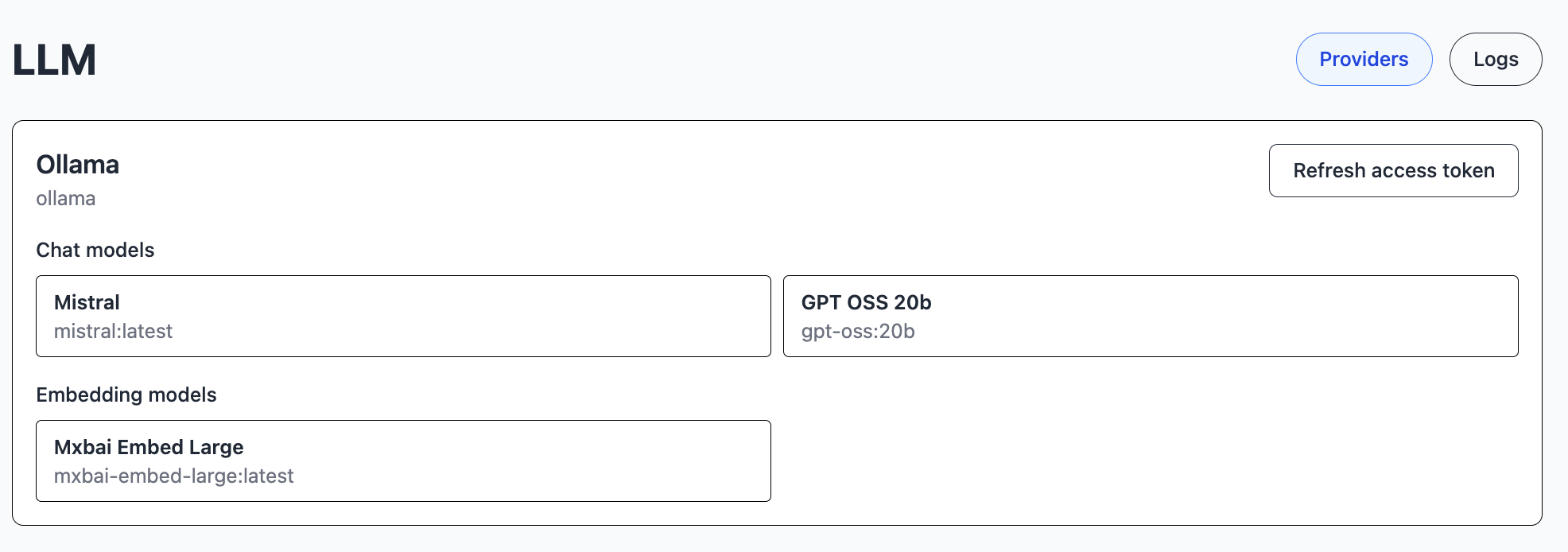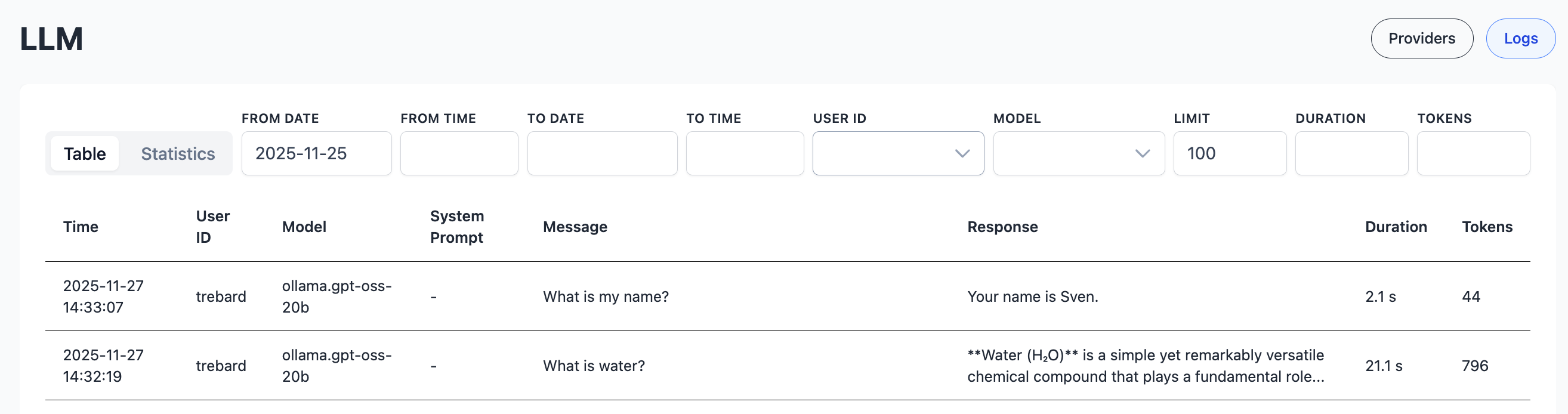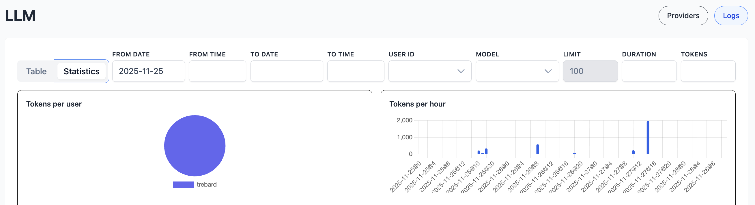 The llm (large language model) module is used for handling and displaying llms. The llms are defined in the application properties. The llm service keeps track of llm token usage for individual users.